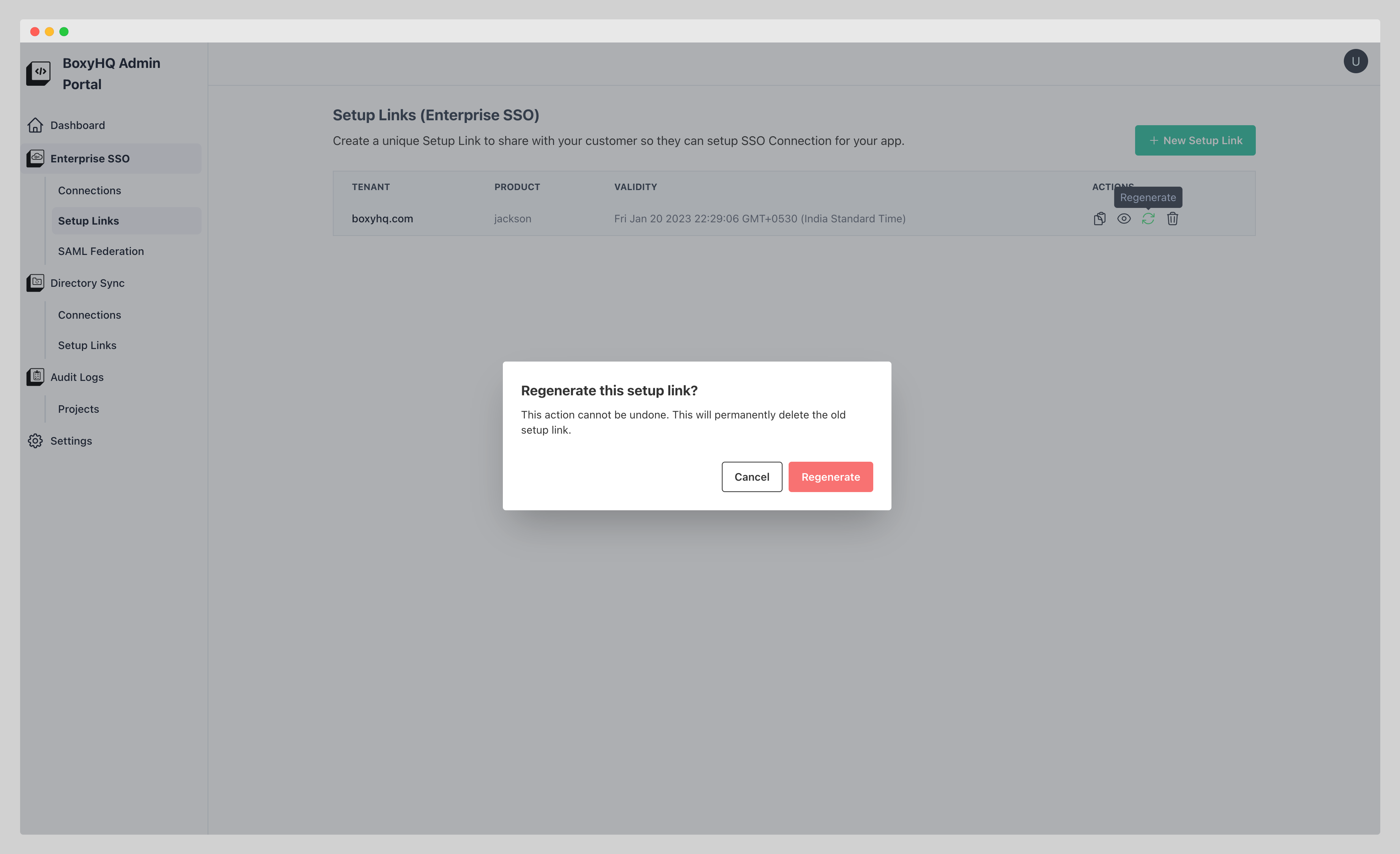 Once you confirm Regenerate action you will see the new setup link in the link info section